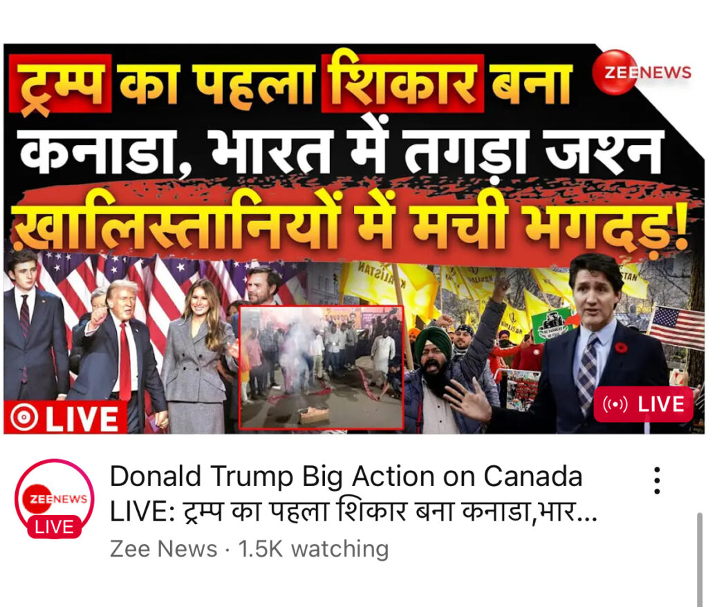 The Indian media continues to resort to sensational headlines in a desperate attempt to intimidate Khalistan supporters. A recent example is a broadcast by Zee News, where dramatic phrases like “Trump’s first target is Canada” and “Khalistanis in panic” are plastered across the screen, accompanied by exaggerated visuals. Such headlines are not only misleading but are also crafted to incite fear and spread misinformation among the masses.