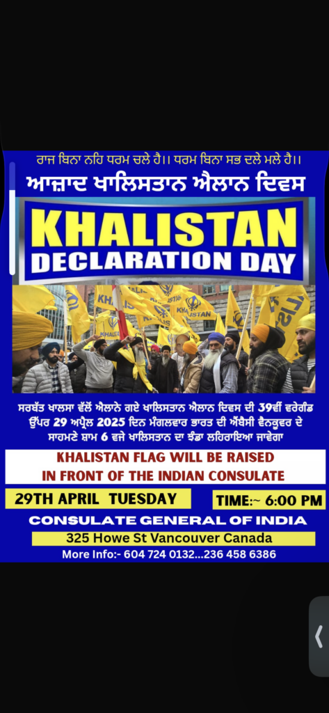 On April 29th, 2025, in front of the Indian Consulate at 325 Howe Street, Vancouver, the Khalistani spirit will once again rise with unbreakable resolve. As the Khalistan Declaration Day is marked, thousands of voices will echo a truth the Indian sectarian government has spent decades trying to silence: We are not Indians. We are Khalistanis.